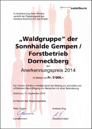 Nach erfolgter Nomination für den Sozialpreis des Kanton Solothurn waren wir sehr gespannt und harrten der Dinge die da kommen. Die Anspannung hat sich dann etwas gelöst als wir eine Einladung für den Donnerstag, 11. September 2014 19.00 – 20.30 Uhr ins Landhaus, Solothurn erhielten. Anlass war die Verleihung des Sozialpreises 2014. Dieser Einladung haben wir mit grosser Freude Folge geleistet und sind pünktlich am Ort eingetroffen. An diesem Anlass durften wir den Anerkennungspreis 2014 entgegennehmen. Wir wollen es auch hier nicht versäumen uns für den Erhalt des Preises zu bedanken. Dieser Preis zeigt uns, dass wir mit dem Projekt "Sonnhalde" auf einem absolut richtigen Weg sind. Dieser Preis ist für uns ein Ansporn und Motivation zugleich dieses Projekt weiter zu führen um uns mit behinderten Menschen gemeinsam in der Natur zu bewegen. Herzlichen Dank für diesen Preis
