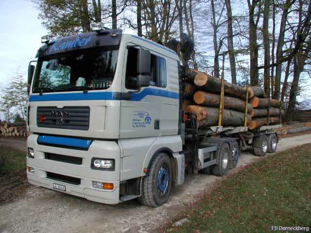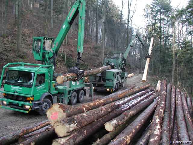 Industrieholz wird mit Lastwagen abtransportiert und Brennholz wird an Ort und Stelle mit dem Hacker zu Hackschnitzeln verarbeitet und gelangt direkt zum Verbraucher oder wird ans Lager genommen .